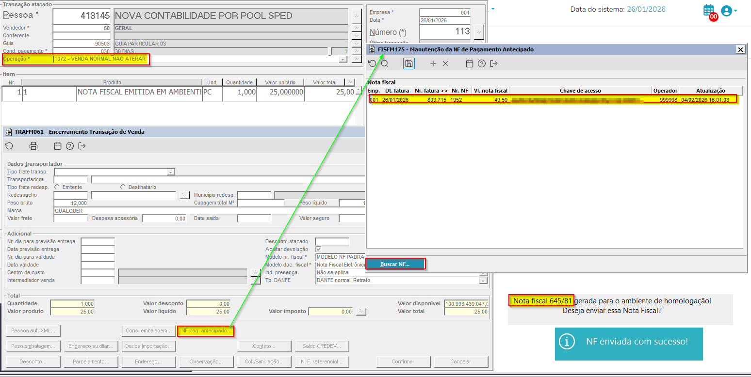 Imagem 07 - Demonstração da emissão de uma NF-e de venda pelo componente TRAFM060. Ao encerrar o processo, o sistema chama o TRAFM061, no qual foi acionado o botão “NF pag. antecipado”. Essa ação chamou o FISFM175 para inclusão da NF de débito, por meio do botão “Buscar NF" e seguida foi teclado o botão de salvar para gravar.