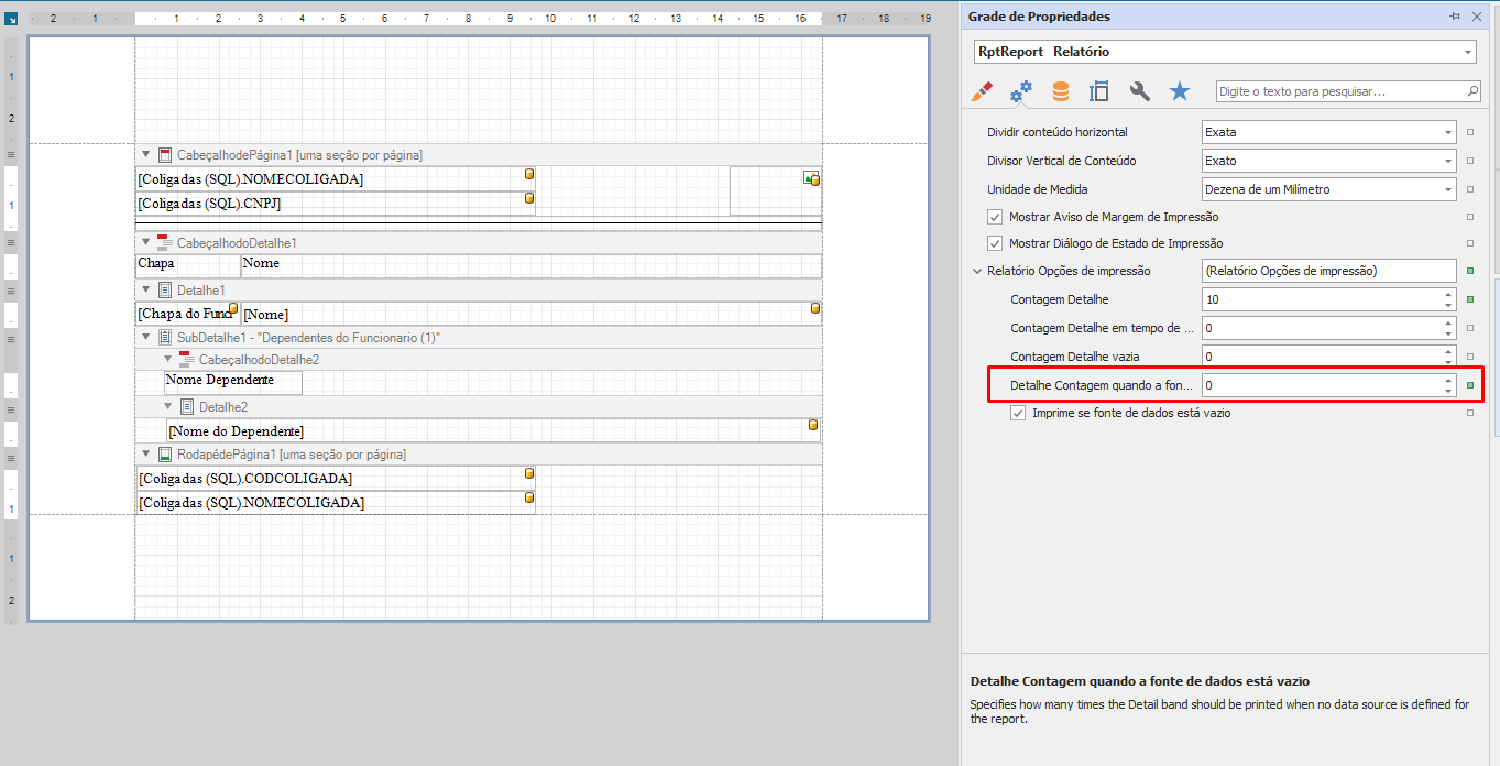 Quando a propriedade "Detalhe contagem quando a fonte de dados está vazio" for 0 e o Subdetalhe do relatório não tiver dados a serem exibidos, as ligações de dados presentes no cabeçalho de página não serão exibidos.