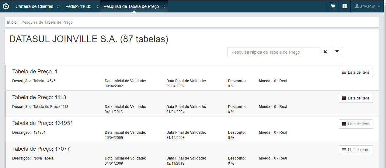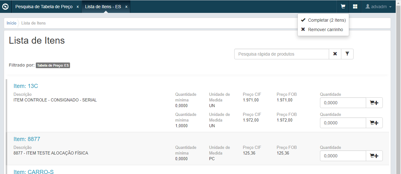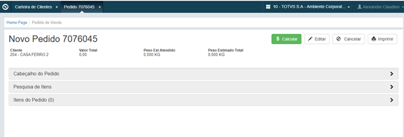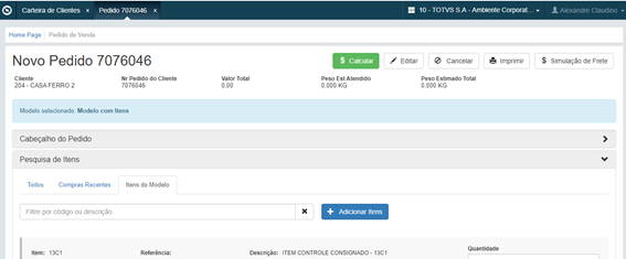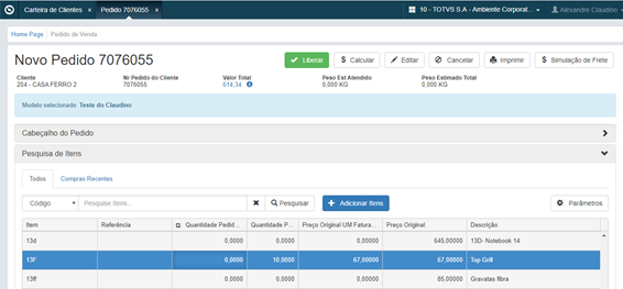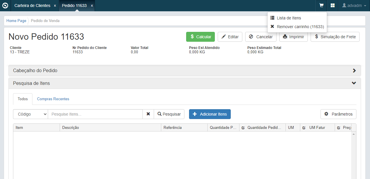 Segundo modo, cuando el representante ya está en la pantalla de registro del Pedido de Venta, o entró vía edición desde la cartera de pedidos), el carrito asume el número del pedido en edición. El representante puede navegar nuevamente a la lista de productos y dirigirlo para la Búsqueda de la Tabla de Precio, y añadir varios productos al carrito de otras tablas de precios, y también puede retirar el carrito o eliminarlo.