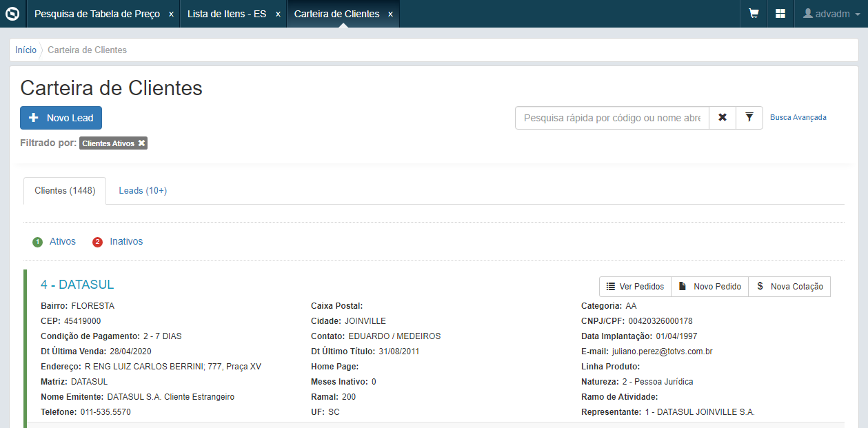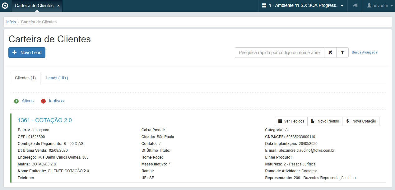 Se ha habilitado la lista de Leads del Representante en la pantalla de Cartera de Clientes en el Portal. Igualmente, en la cartera de clientes del portal, ahora es posible incluir pedidos en etapa de cotización para un Lead.