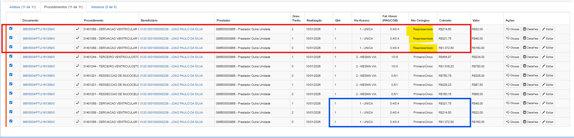 O movimento é marcado como "Reapresentado", indiferente de seu status. Inclusive movimentos que estejam em auditoria podem receber o ato cirúrgico como "Reapresentado".