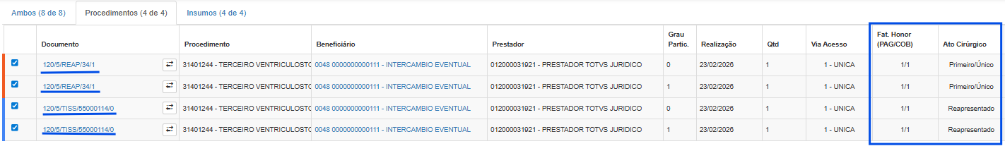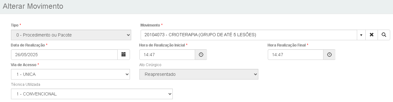 Se o movimento da reapresentação for removido ou o lote da reapresentação for cancelado, o movimento original voltará ao seu estado inicial e o campo "Ato cirúrgico" será novamente habilitado para edição.