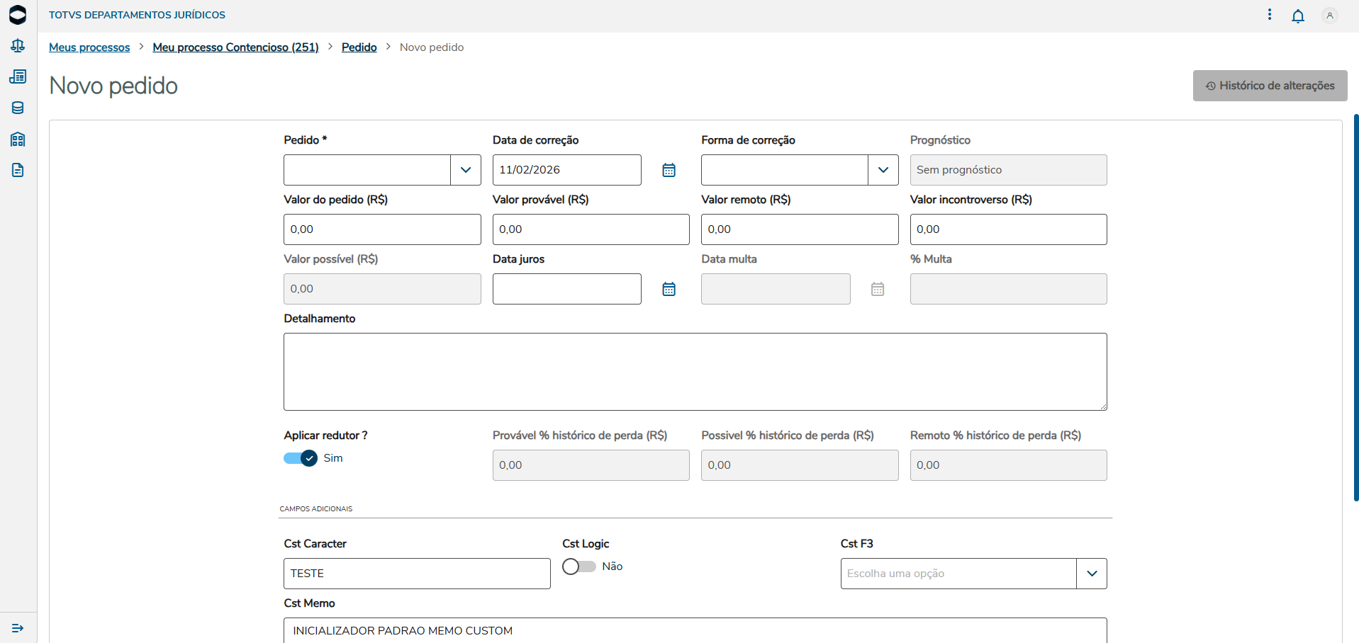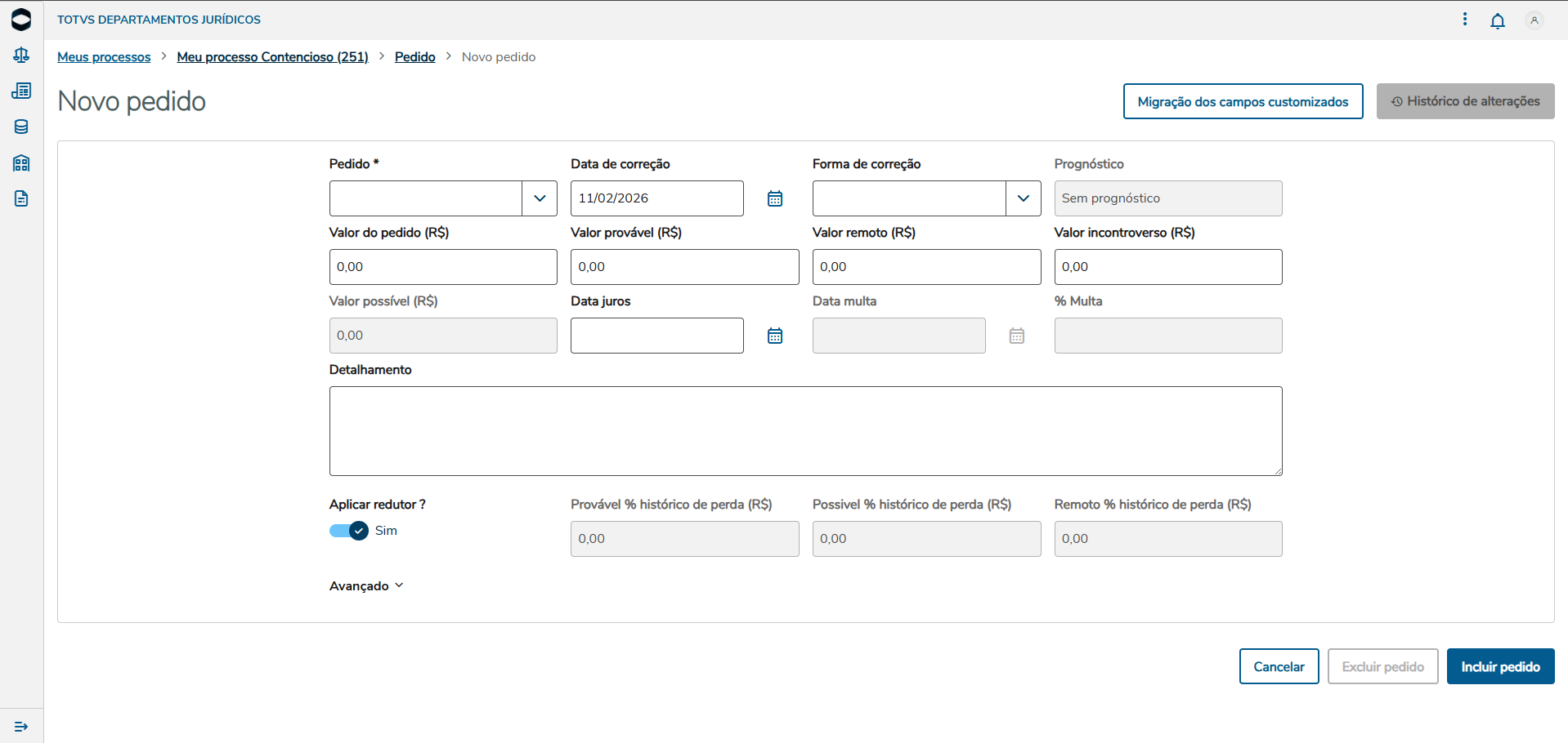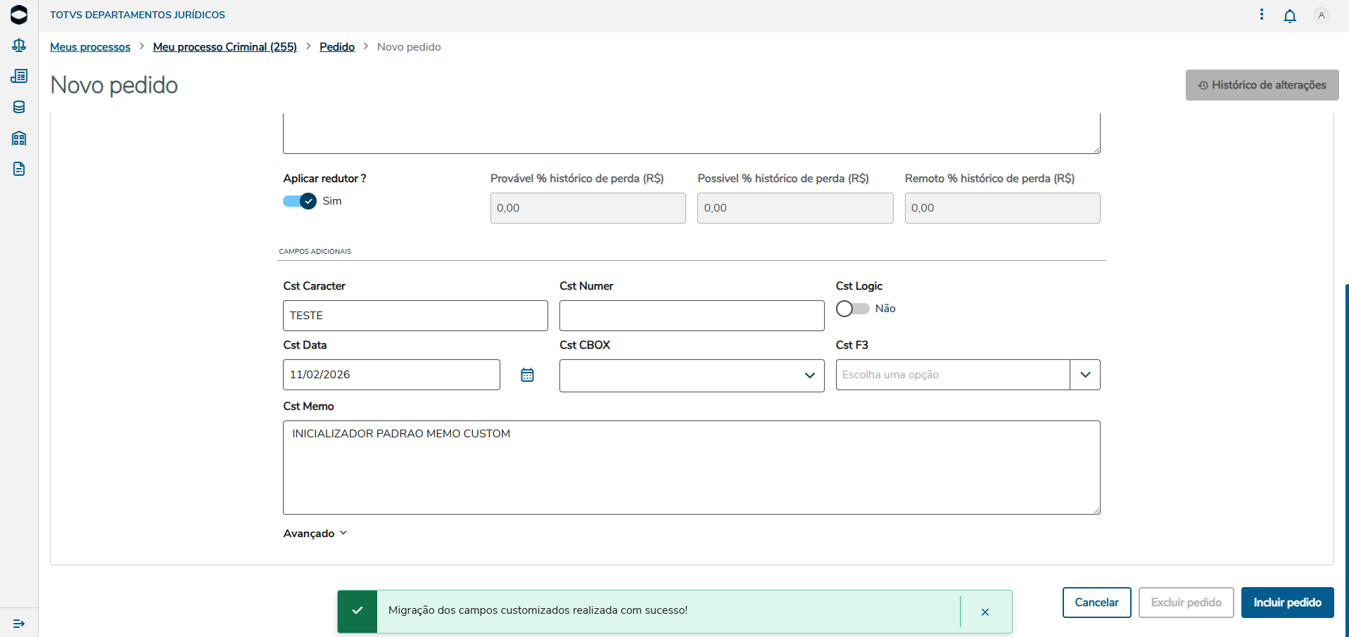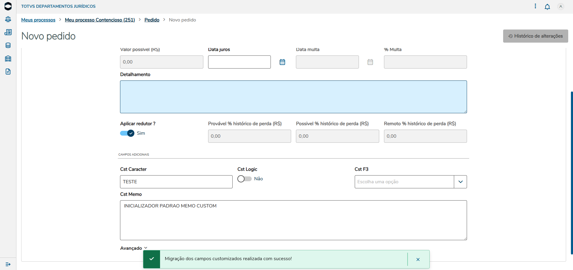 Exemplo na tela de pedidos, ao acessar o cadastro é mostrado um botão de Migração dos campos customizados. Note que estamos em um processo contencioso e que não tem campos customizados visíveis na tela.