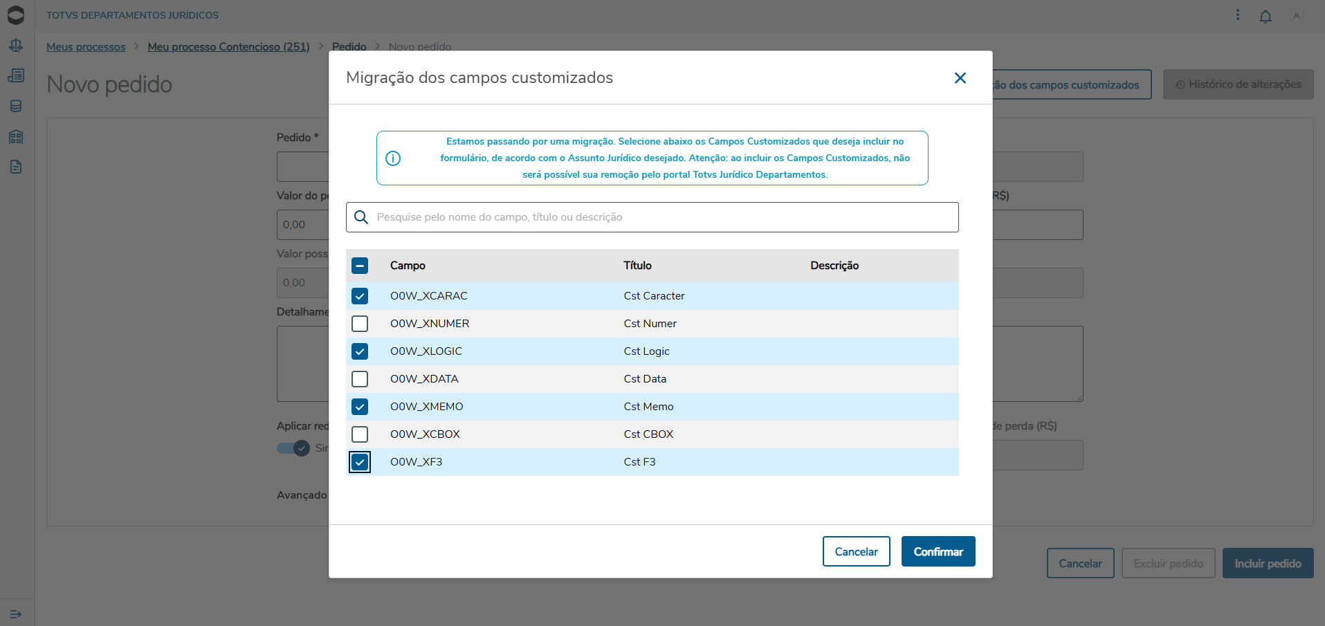 Ao clicar sobre o botão é aberto uma janela para a seleção dos campos. Ao selecionar podemos clicar sobre confirmar, a tela vai realizar a migração e ao final fechar a janela com uma mensagem de sucesso. Note que nesse momento será enviado os campos padrão mais os campos customizados da entidade.