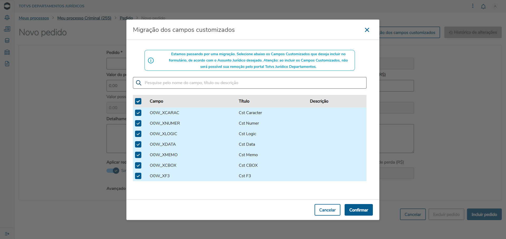 Agora para diferenciar por assunto jurídico, foi acessado um processo criminal, por conta disso os campos na janela de migração são todos os customizados, pois para esse assunto jurídico ainda não foi migrado. Note que todos os campos foram selecionado.