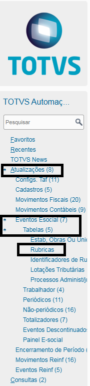 1. Acesse a rotina em TOTVS Automação Fiscal > Atualizações> Eventos Esocial >Tabelas > Rubricas: