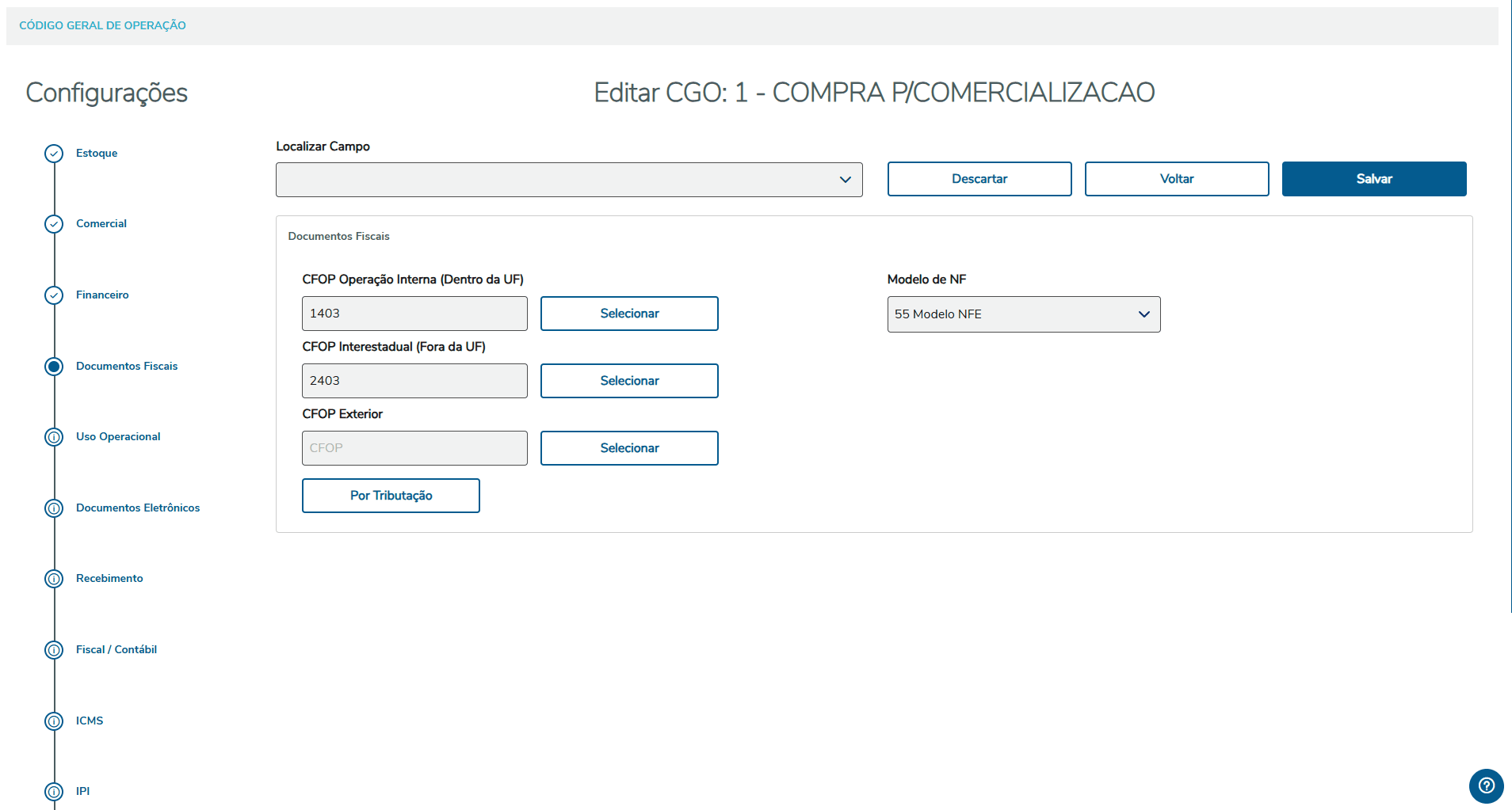 Foi identificado que no Código Geral de Operação Web - WEBCAD023, na guia de Documentos Fiscais, ao acessar a tela de CFOP por Tributação e cadastrar um CFOP por UF, a configuração Por UF só era salva caso a opção Salvar fosse selecionada em ambas as telas, na modal de CFOP e na modal de CFOP por UF.