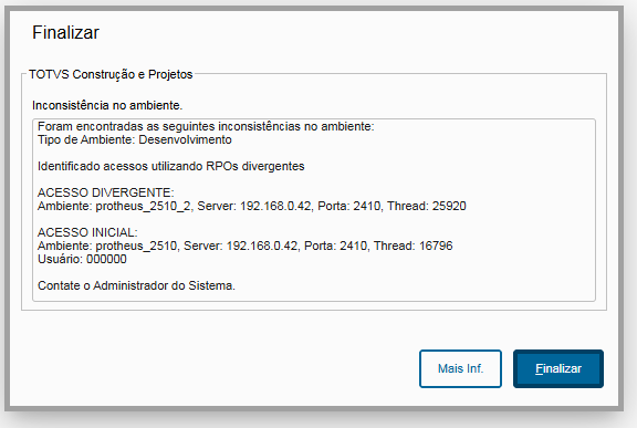 • Mensagem de Aviso: Caso o sistema identifique que o RPO é diferente daquele que está em uso, uma mensagem de aviso será exibida, informando sobre a divergência e identificando a conexão que a está utilizando.