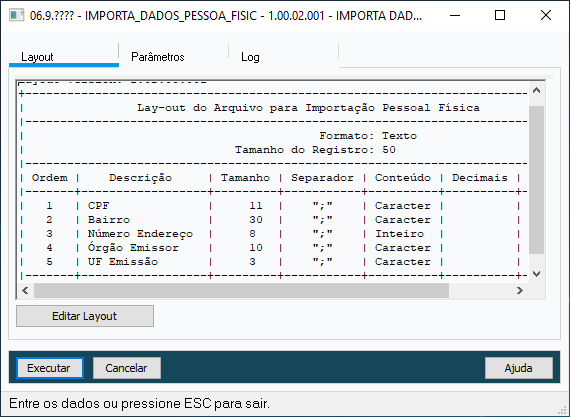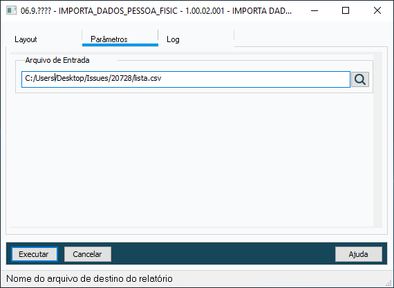 • Após configurar o caminho do arquivo na aba Parâmetros, clique no botão Executar para iniciar o processo.