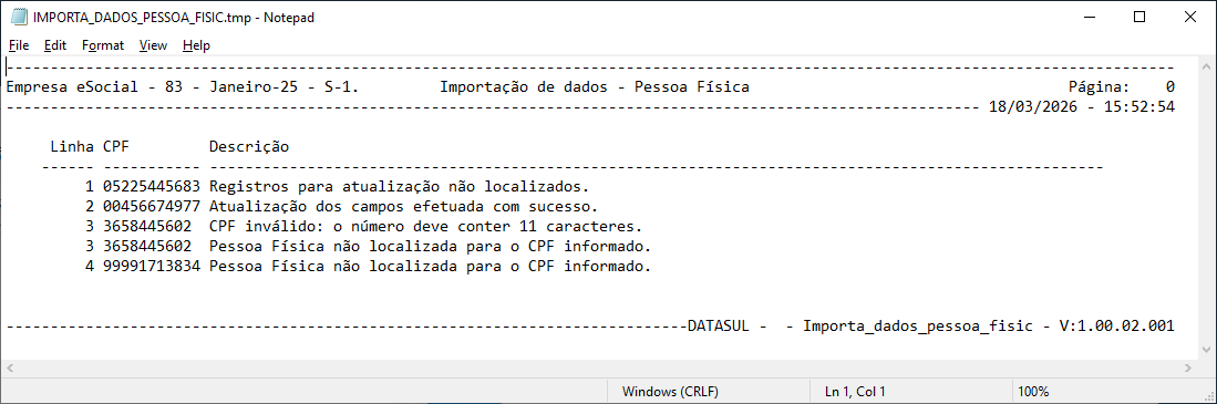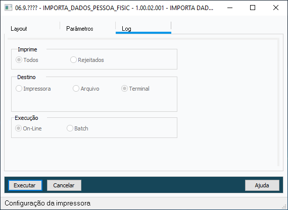 • Aba Log: Nesta aba, contem a informação que o arquivo será gerado em terminal, detalhando o resultado de cada registro (sucesso ou erro).