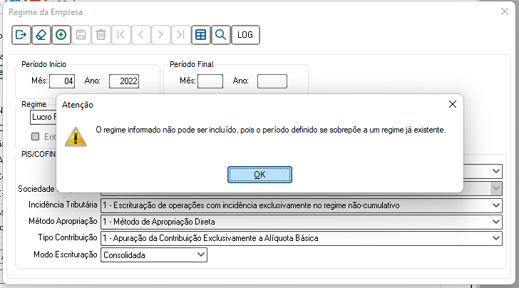 Anteriormente, o sistema possibilitava a gravação de um novo regime mesmo quando suas datas de vigência coincidiam com registros já existentes. Esse comportamento também ocorria em cenários com regimes sem data final definida, o que gerava inconsistências fiscais.