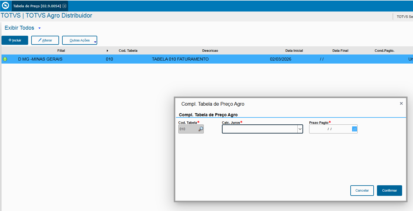 Criar tabela de extensao da tabela de preço no botão Outras Ações chamada AgroDistribuidor