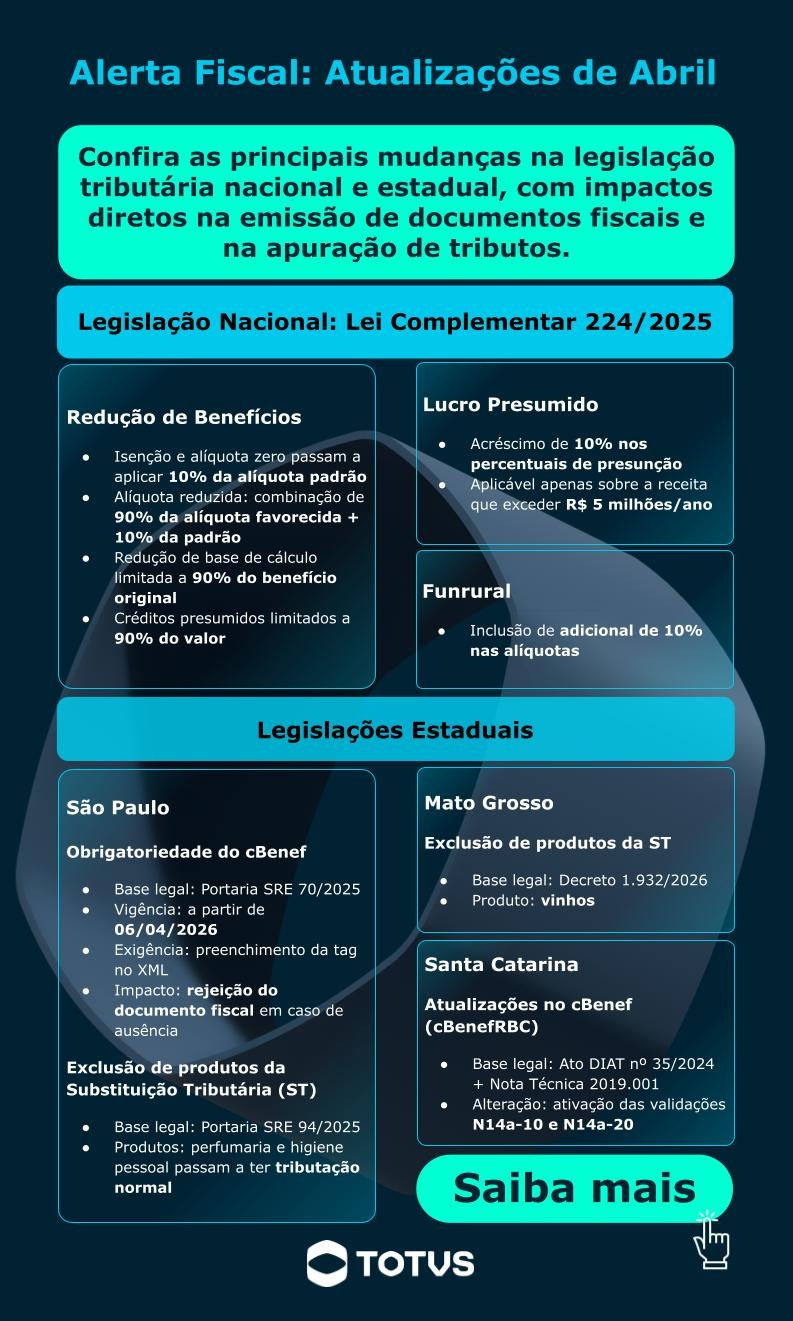 Mais detalhes: 534 TOTVS Informa - 📢 Alerta Fiscal: Atualizações de Abril - https://tdn.totvs.com/pages/viewpage.action?pageId=1052329238Atenciosamente,Equipe TOTVS