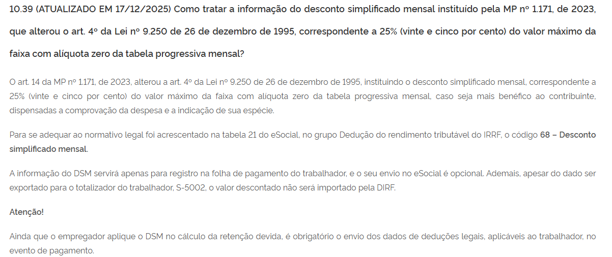 Resposta: | A apuração do Imposto de Renda Retido na Fonte (IRRF) observa as regras estabelecidas pela Receita Federal do Brasil, especialmente no que dispõe a Instrução Normativa RFB nº 1.500/2014, a qual prevê, em seu art. 52, a possibilidade de dedução de determinadas parcelas para fins de determinação da base de cálculo do imposto, tais como contribuição previdenciária, dependentes, pensão alimentícia e previdência privada. Com a alteração promovida pela Medida Provisória nº 1.171/2023, que alterou o art. 4º da Lei nº 9.250/1995, passou a ser admitida a utilização do desconto simplificado mensal, correspondente a um percentual fixo da faixa de isenção da tabela progressiva, em substituição às deduções legais, quando mais vantajoso ao contribuinte. Nesse contexto, ao optar pelo desconto simplificado, as deduções legais deixam de ser consideradas exclusivamente para fins de apuração do IRRF, não impactando a base de cálculo do imposto. Entretanto, no âmbito do eSocial, a lógica aplicável não se restringe à apuração do tributo, mas sim à prestação de informações de natureza fiscal, trabalhista e previdenciária de forma íntegra e consistente. O sistema possui caráter declaratório, conforme instituído pelo Decreto nº 8.373/2014, e tem como finalidade alimentar as bases de dados utilizadas pela administração tributária, incluindo a composição da DCTFWeb, bem como viabilizar cruzamentos fiscais e o pré-preenchimento da declaração de imposto de renda da pessoa física. Nesse sentido, ainda que as deduções legais não sejam utilizadas no cálculo do IRRF em razão da aplicação do desconto simplificado mensal, tais informações permanecem existentes no contexto fiscal do trabalhador e devem ser devidamente declaradas. A própria orientação oficial do eSocial, constante no FAQ 10.39 (atualizado em 17/12/2025), estabelece expressamente que, mesmo quando aplicado o desconto simplificado mensal, é obrigatório o envio dos dados de deduções legais aplicáveis ao trabalhador no evento de pagamento. Assim, a não utilização das deduções no cálculo não afasta a obrigatoriedade de sua informação no evento S-1210. Dessa forma, conclui-se que o desconto simplificado mensal substitui as deduções legais apenas para fins de apuração do imposto, não afastando a obrigação de prestação dessas informações no eSocial. Portanto, as deduções legais, inclusive a dedução por dependentes, devem ser informadas no evento S-1210, ainda que não tenham sido consideradas no cálculo do IRRF ou que não haja retenção de imposto, em conformidade com a orientação oficial do sistema e com a natureza declaratória da obrigação acessória. |