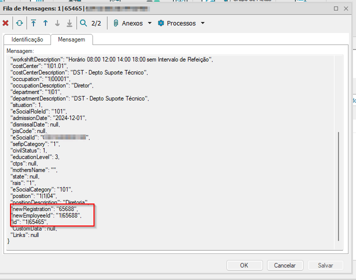 Mensagem gerada com as tags "newRegistration" e "newEmployeeId".