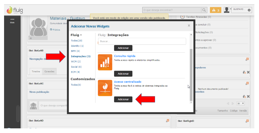 - Clique em 'Integrações', localize o Widget 'Acesso Centralizado' e na sequência clique em 'Adicionar'.