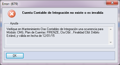 Al ocurrir el mensaje 679 (Cta Ctble de Integración no existe o es invalida).