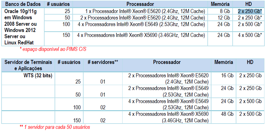 1 servidor (2 processadores) para Banco de Dados (Linux RedHat ES):