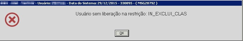 Este alerta ocorre devido ao usuário não ter permissão para prosseguir com o processo, sendo necessário a liberação desse na restrição citada no alerta, IN_EXCLUI_CLAS, que pode ser acessada pelo F1 na própria rotina, ou na rotina ADMFM024.