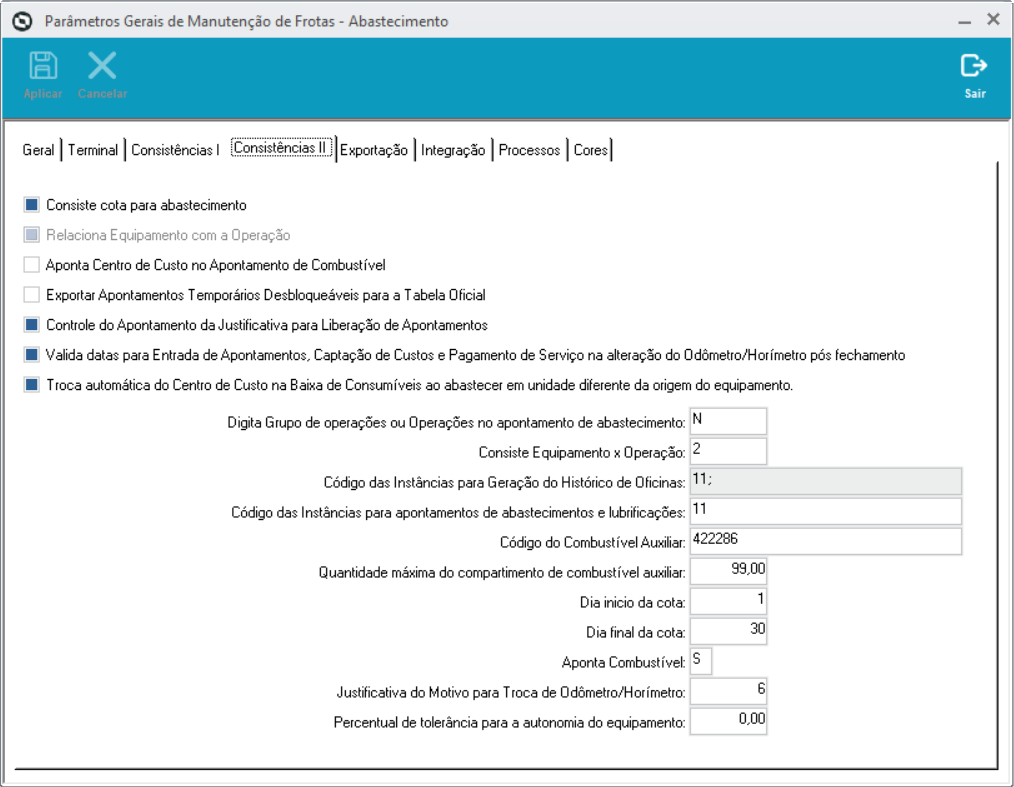 Consiste consumo de combustível on-line (Apenas digitação) | Habilita/desabilita a validação do consumo on-line na digitação de apontamentos |
