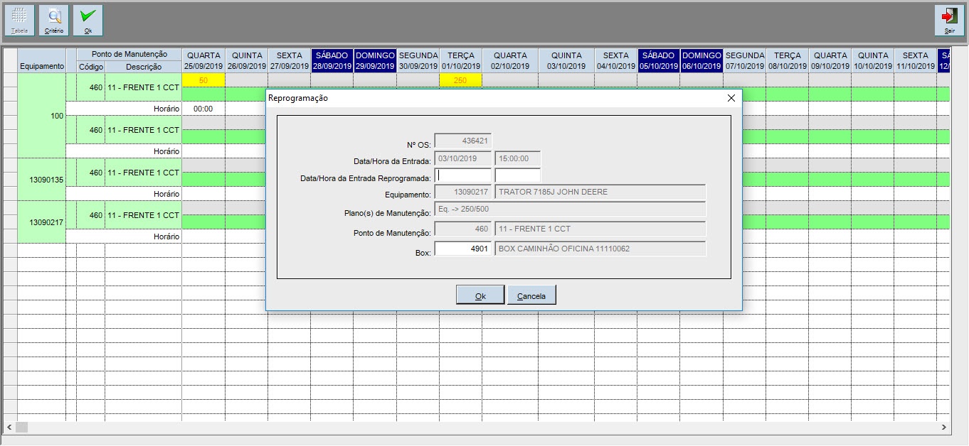 Status "Reprogramado": Esse status deve ser informado quando a manutenção preventiva programada não foi realizada no período planejado e foi reprogramada para que a execução seja realizada em uma data futura. Após clicar no botão "OK" no canto superior esquerdo, os planos que estiverem preenchidos com esse status, o sistema irá alterar as ordens de serviço, atualizando as datas de entrada e de saída prevista.