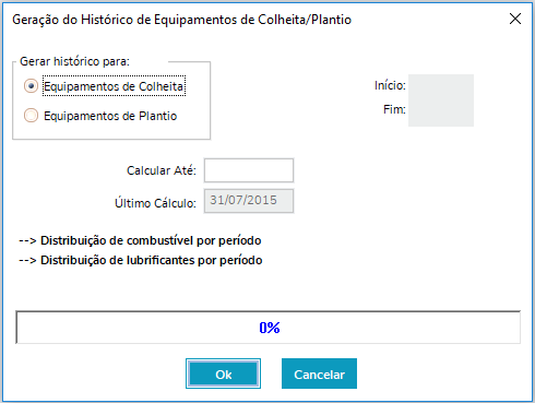 Equipamentos de Colheita: Selecione esta opção para sumarizar o consumo de combustíveis e óleo lubrificante hidráulico e atualizar o histórico de produção de Equipamentos utilizados na Colheita.