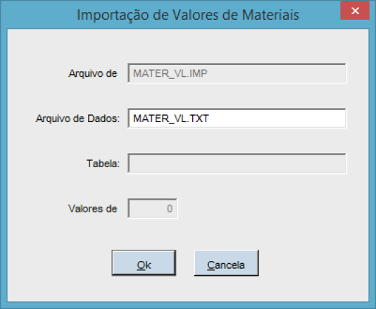 Informe o nome do arquivo para importação dos valores de materiais. |