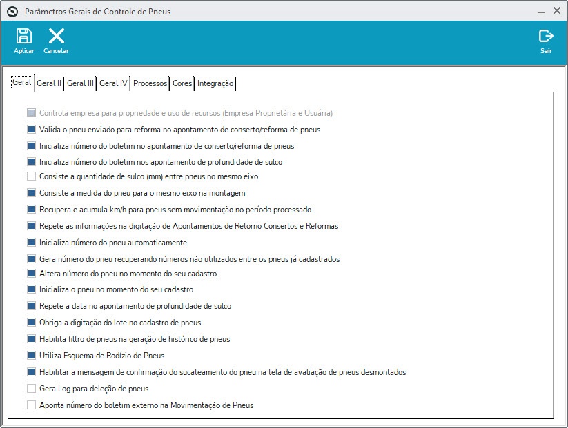 Controla empresa para propriedade e uso de recursos (Empresa Proprietária e Usuária) | Habilita/desabilita o controle de equipamentos, agregados e pneus por empresa proprietária e usuária. |