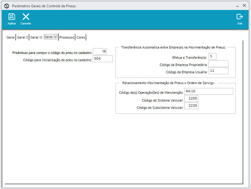 | Utiliza Esquema de Rodízio de Pneus | Habilita/Desabilita a utilização do esquema de Rodízio de Pneus |
