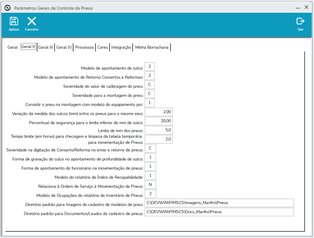 Nas telas anteriores, visualizamos os Parâmetros utilizados pela aplicação MANFRO Pneus.