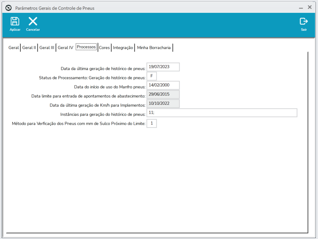 Instâncias para geração do histórico de Pneus | Informar a(s) instância(s) para recuperação dos pneus e apontamentos para a geração de históricos dos mesmos. |