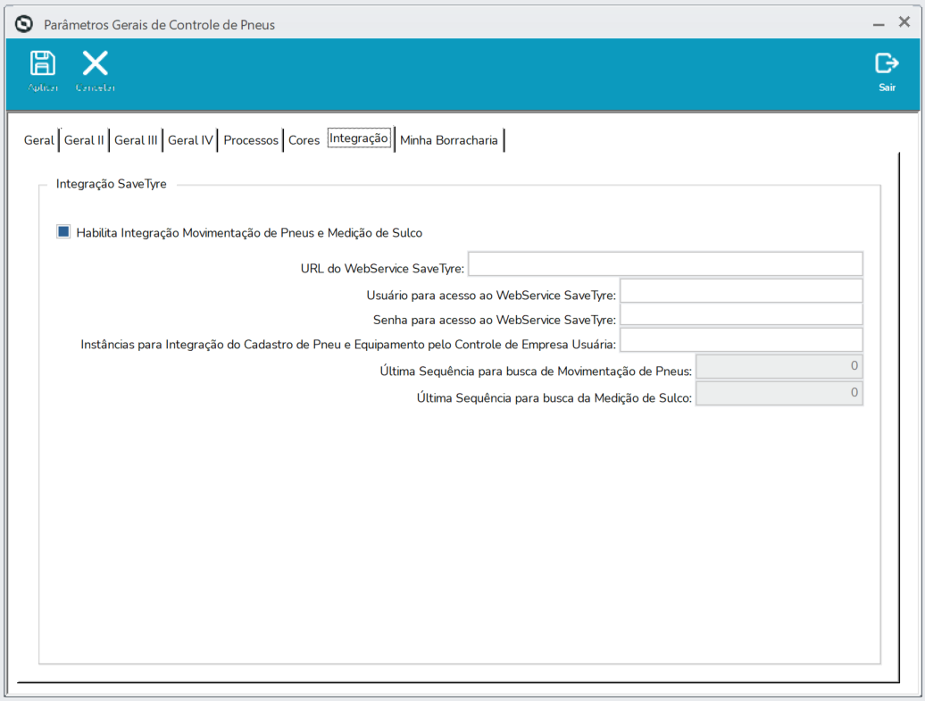 Última Sequência para busca de Movimentação de Pneus | Mostra o último número sequencial gerado pela SaveTyre na exportação das movimentações de pneus. Isso é utilizado para controlar os apontamentos que serão recuperados na próxima integração, onde a sequência inicial será a última + 1. |
