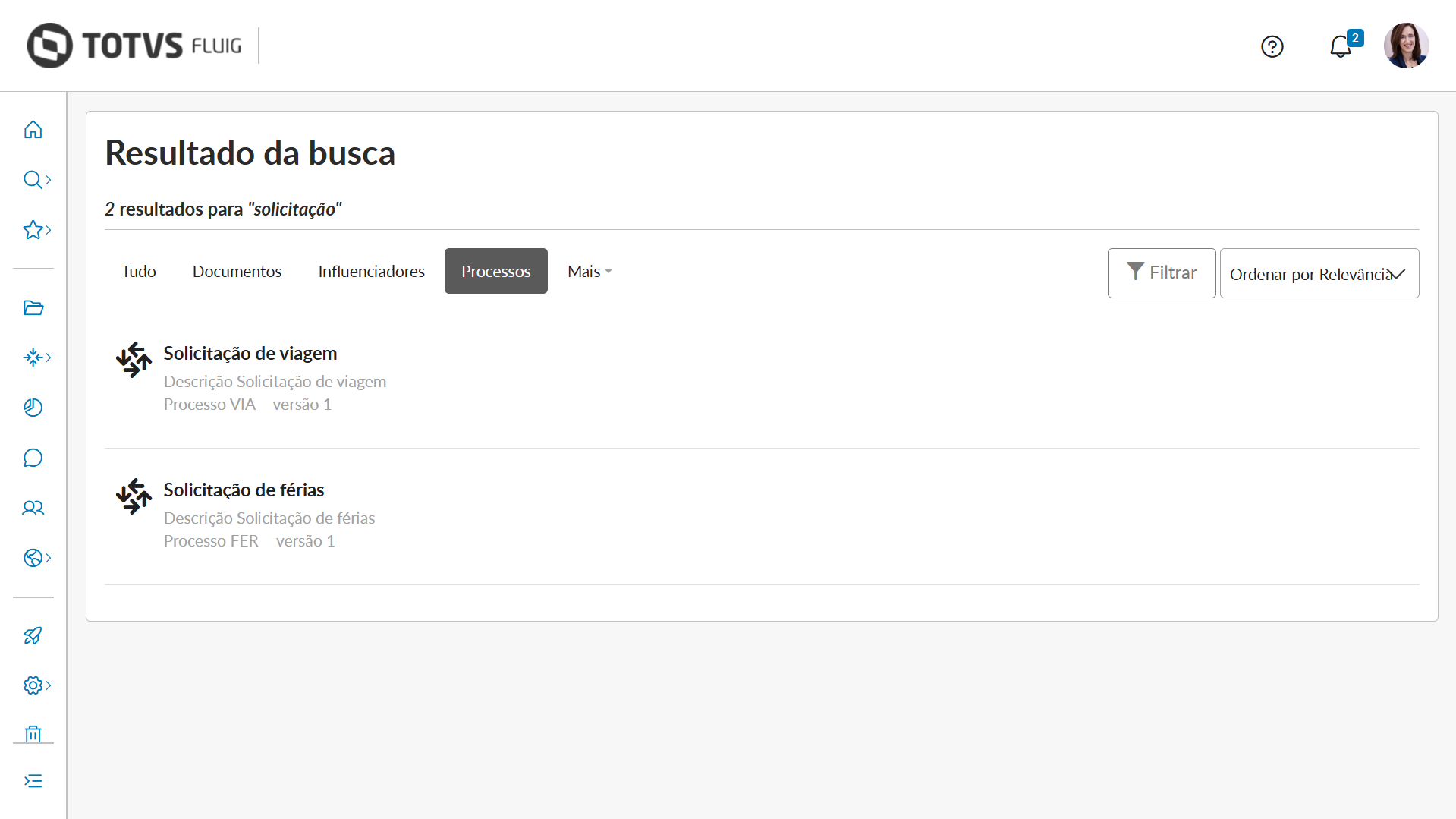 Toda busca apresenta o resultado ordenado por relevância. É possível alterar a ordenação do resultado para mais recente ou mais antigo. Para isso, acione a caixa de seleção no canto superior direito da tela de resultado e selecione uma opção.