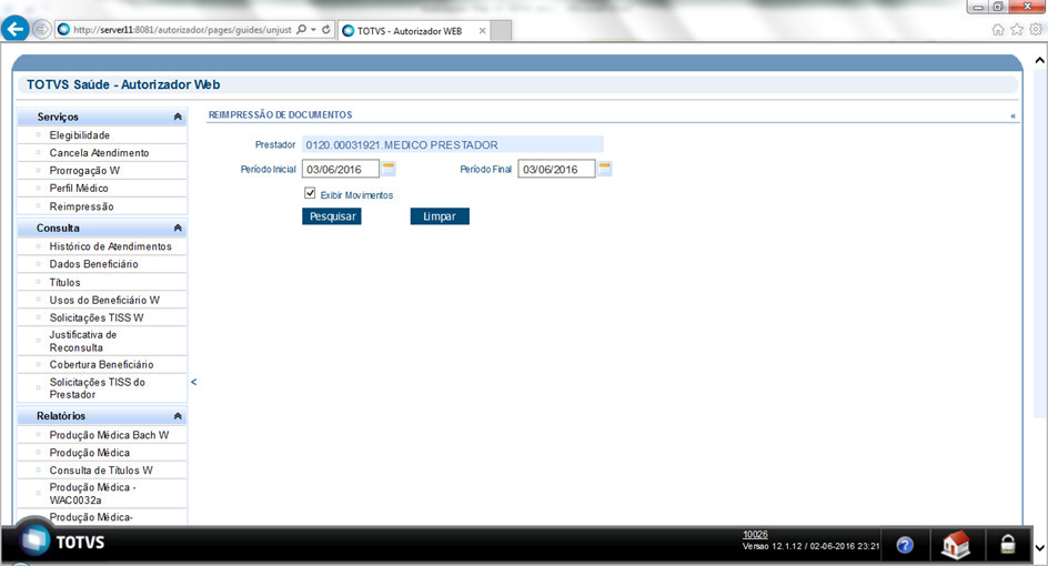 | Prestador | Unidade, código e nome do prestador logado. |