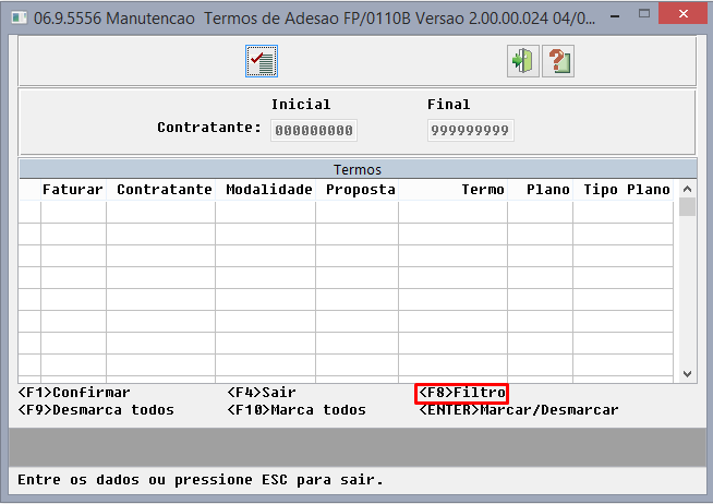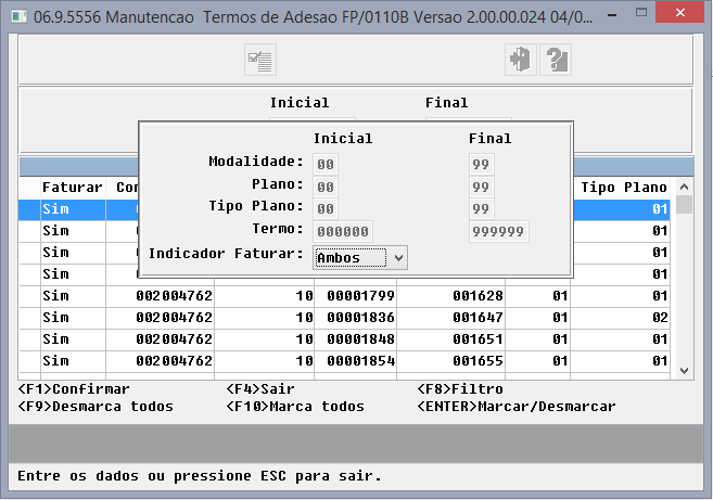 Esta implementação tem por objetivo permitir filtrar a listagem do programa Manutenção Indicador Faturamento Termo Adesão - fp0110b, opção "F6" (Atualizar Indicador Faturar).