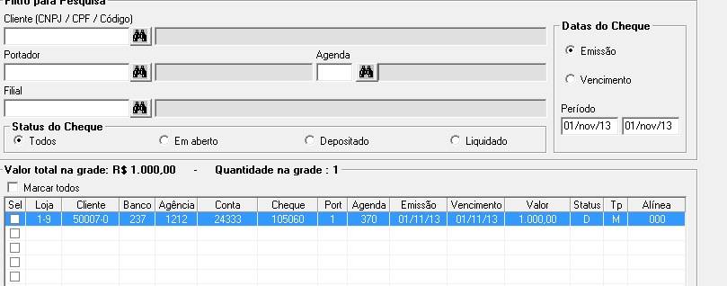 Nesta tela o usuário poderá selecionar as opções desejadas para emissão de um extrato dos cheques cadastrados na base de dados, seja por cliente, por data de emissão ou vencimento ou ainda a combinação de qualquer escolha.