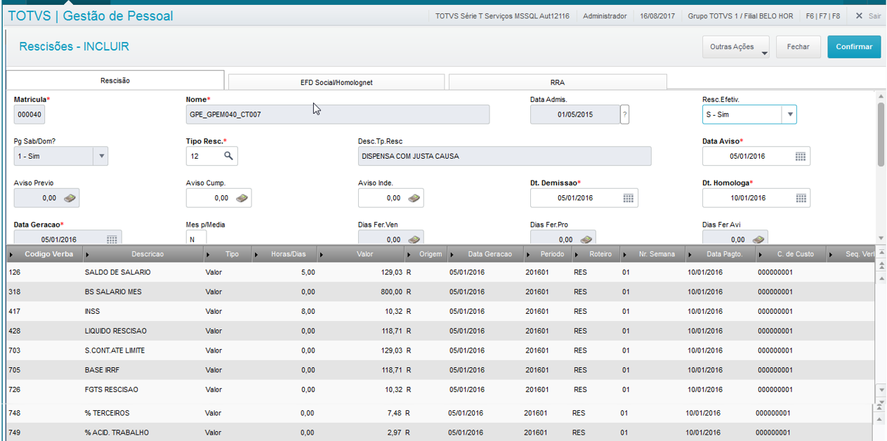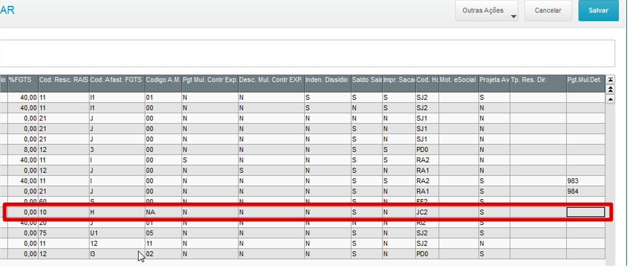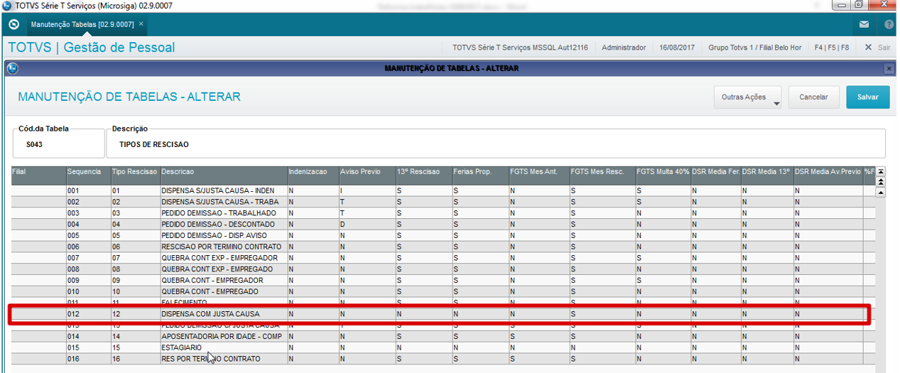 - Criar um tipo de rescisão por justa causa na tabela S043