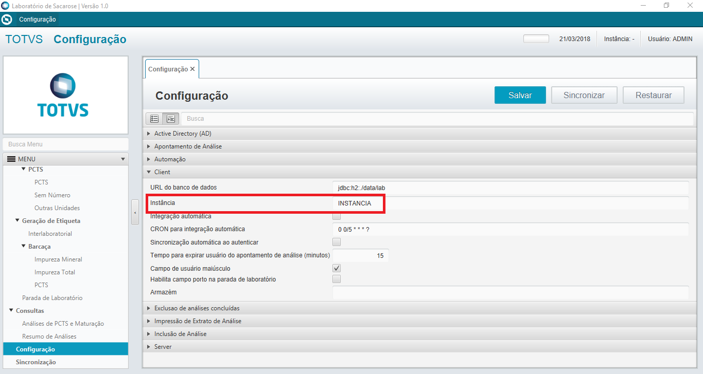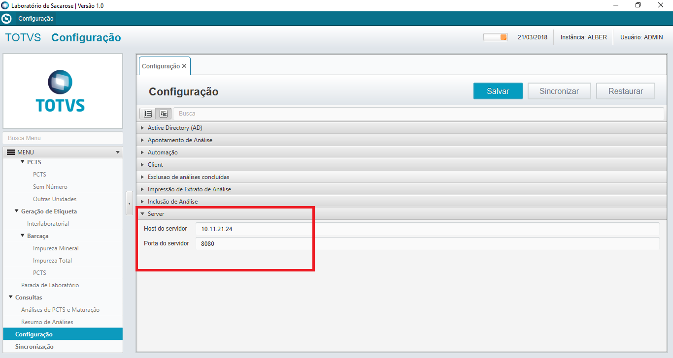 Este manual tem como objetivo fornecer os passos necessários para instalação e configuração do aplicativo Laboratório Offline Desktop. As instruções aqui apresentadas contemplarão desde a instalação dos softwares necessários, bem como a implantação e configuração inicial da aplicação nestes ambientes, em plataforma Windows. 2. Instalação da JDK Com a versão 1.8 (32 bits) do instalador, prossiga com a execução do mesmo: Na próxima etapa configuramos o diretório da instalação. Clicando em change, alteraremos o caminho de instalação para: C:\totvs\jdk Após prosseguir, será iniciada a instalação do Java. Na sequência será solicitado o local de instalação do JRE (Java Runtime Environment). Como caminho para o JRE, informe C:\totvs\jre. Na última tela, ao clicar em Finish, encerramos a instalação. 2.1. Configuração da variável de ambiente Definir as seguintes variáveis de ambiente abaixo como sendo do sistema: Nome da variável: JAVA_HOME Valor da variável: C:\totvs\jdk Inserir na variável Path: %JAVA_HOME%\bin;(restante do path) 2.2. Teste da instalação e configuração do Java Ao acessar o terminal, o comando abaixo pode ser executado para verificar se a instalação e configuração foram realizadas com sucesso. Após a execução do comando deve ser possível visualizar as informações da versão instalada. 3. Execução da Aplicação e configurações básicas Com o JAR do Laboratório Offline disponível e, de preferência no diretório indicado (C:\totvs\LAB_OFF) ,clicar sobre o mesmo duas vezes. A tela de login deve ser aberta. Para realizar as configurações iniciais, deve-se fazer o login utilizando um usuário de administrador, senha e selecionar a opção "Sessão administrativa". Após iniciar a aplicação, acesse no menu principal a opção "Configuração". Configurar a automação acessando a aba "Automação" na tela de configuração e definir seus valores de acordo com o equipamento. Principais Campos: 1 - Diretório onde deve estar as bibliotecas de comunicação com o TRD, exempo: C:\totvs\LAB_OFF\TRD\DLL. 2 - Porta de comunicação serial e seus atributos. 3 - Tempo de visualização da mensagem no TRD. 4 - Tamanho do número da etiqueta do funcionário. Devemos configurar a instância do usuário na aba "Client". Essa instância deve ser a mesma que foi configurada no Server. Ainda na aba "Client", é possível definir se a integração de análises com o servidor deve ser automática ou não, definindo no campo CRON o tempo em que essa integração deve ocorrer. Também é possível definir se a sincronização automática de configurações ocorrerá ao abrir a aplicação. Configurar o local e a porta onde o servidor de aplicação foi configurado. Para isso, acesse a aba "Server" ainda na tela de configurações e preencha os campos Host e Porta do servidor. Para verificar se a configuração está correta, apenas salve as configurações e clique em "Sincronizar".A mensagem da imagem abaixo deve ser mostrada confirmando o sucesso da configuração. Acessar o item de menu "Sincronização" para recuperar todas as informações do servidor. Após sincronizar, a mensagem de sucesso abaixo deve ser mostrada. Após as configurações serem salvas, sincronização realizada e a aplicação reiniciada, o usuário da aplicação poderá realizar seu login na aplicação, utilizando as credenciais utilizadas no sistema PIMSCS. Toda vez que o login é feito com sucesso, os dados de acesso do usuário são salvos localmente para casos de acesso em contingência (sem acesso ao servidor). 4. Configuração do AD No item de menu de Configuração, acessar a aba "Active Directory (AD)".