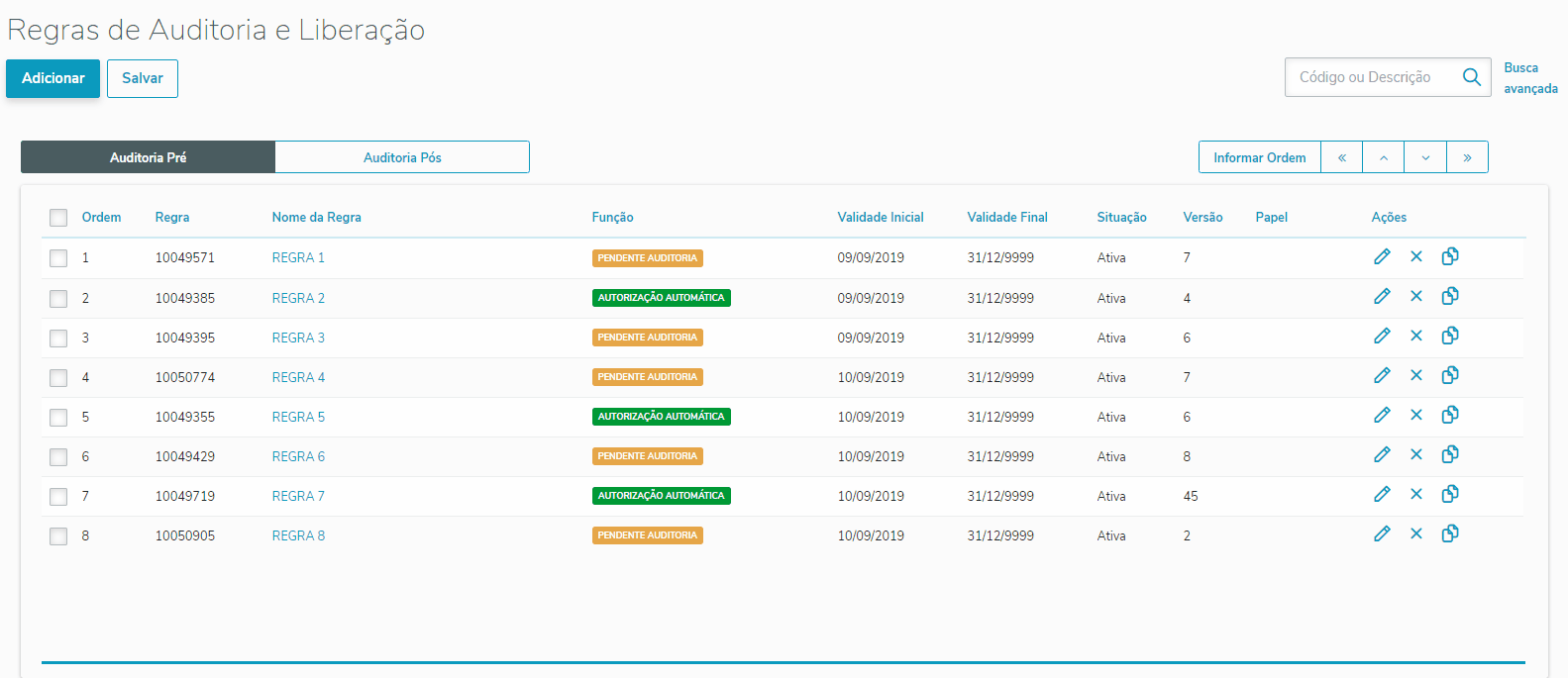 As regras de auditoria sempre serão criadas inativas (ordem igual a 999999). Portanto, para que as novas regras criadas sejam consideradas, as mesmas deverão ser ativadas.