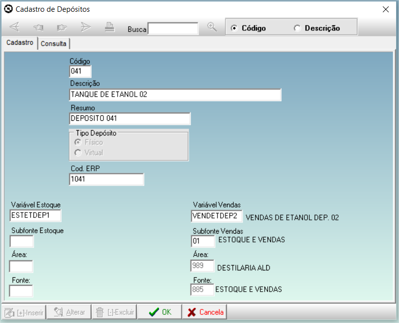 | Tipo de Depósito | Físico: depósito físico instalado na indústria (não se trata do ERP) Virtual: depósito virtual afim de realização de rateios |