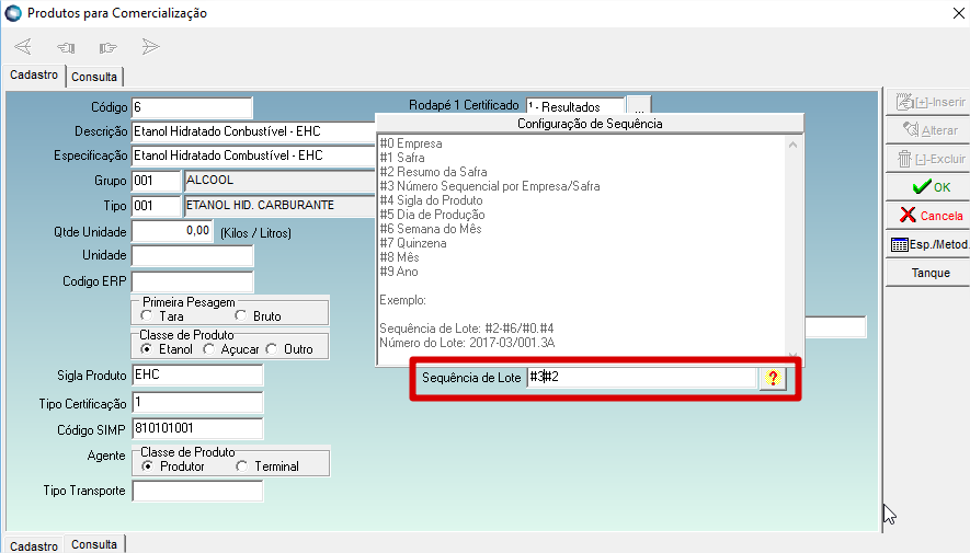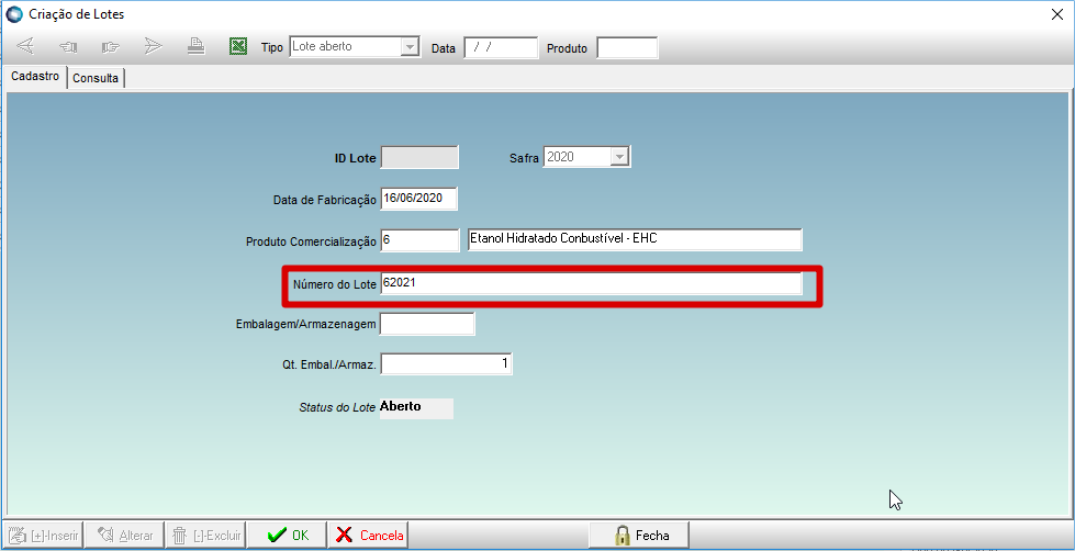 02.3. Em "Criar Lote", ao selecionar o produto de comercialização, o número do lote será criado conforme sequencia informada: