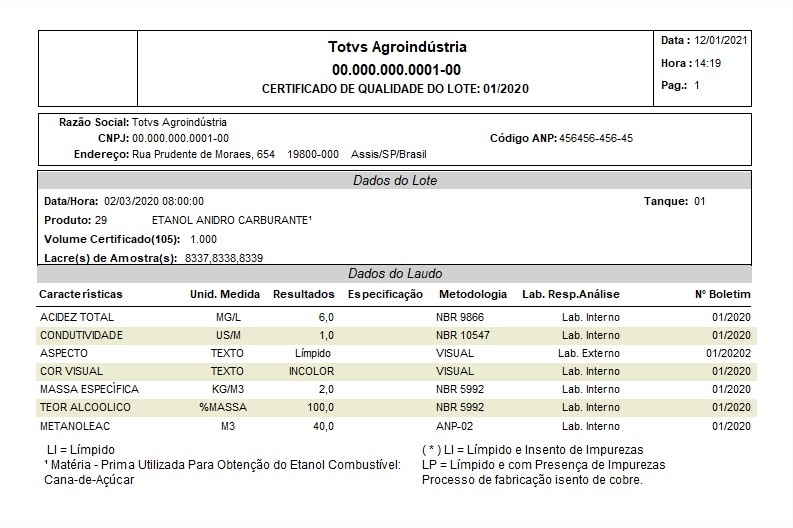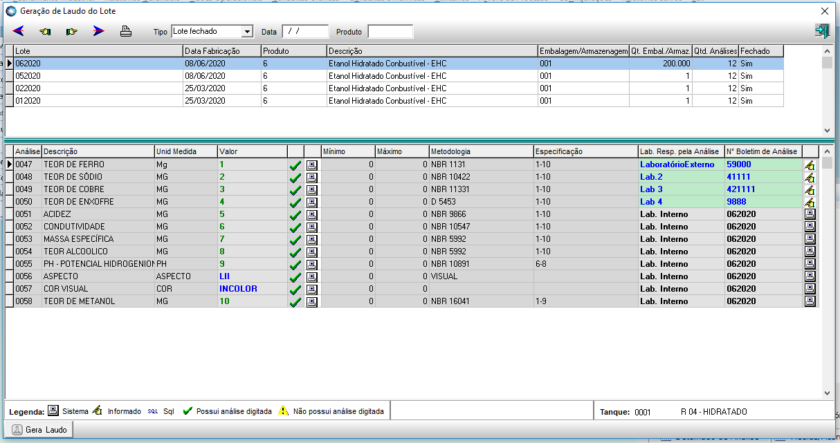 - Imprime o Certificado de Qualidade do Lote (com todas as análises - internas e externas)