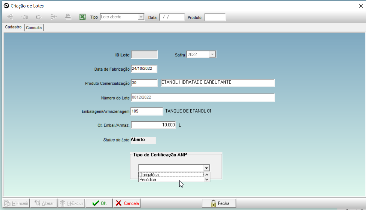 - O tipo de Certificação ANP está previamente cadastrado no cadastro de tabelas SIMP e atrelado a um produto do tipo BIOCOMBUSTÍVEL