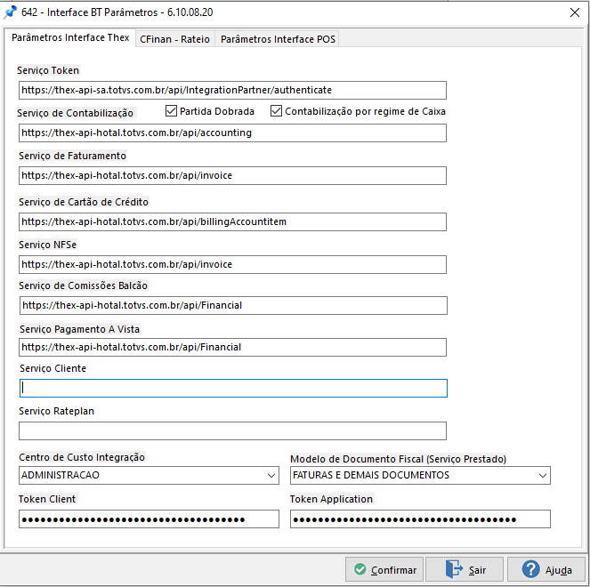 Para acesso ao Thex é necessário configurar os Tokens Client e Application e para isso precisamos do plugin Interface BT Parâmetros código 642.