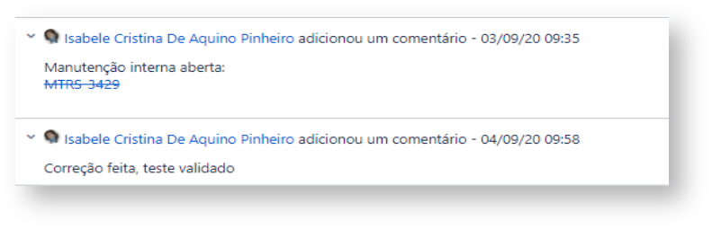 na issue deste cenário aberto contendo o número da issue de manutenção criada, posteriormente alimentando a planilha: