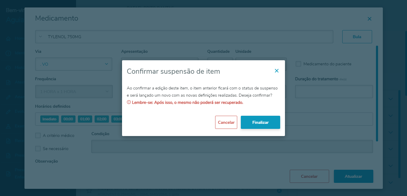 Sempre que o usuário editar um item já lançado/vigente, após a liberação do item na prescrição, o comportamento deverá ser o de suspender o item anterior e lançar um novo item com a atualização realizada pelo usuário.