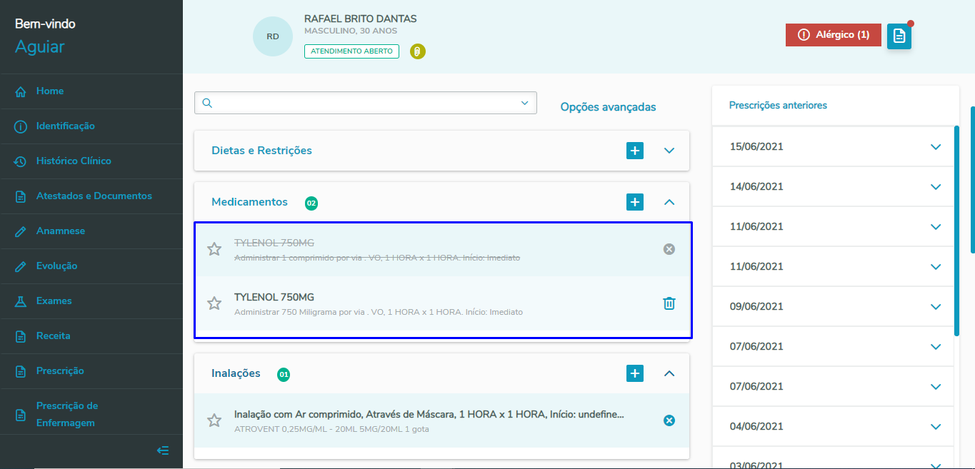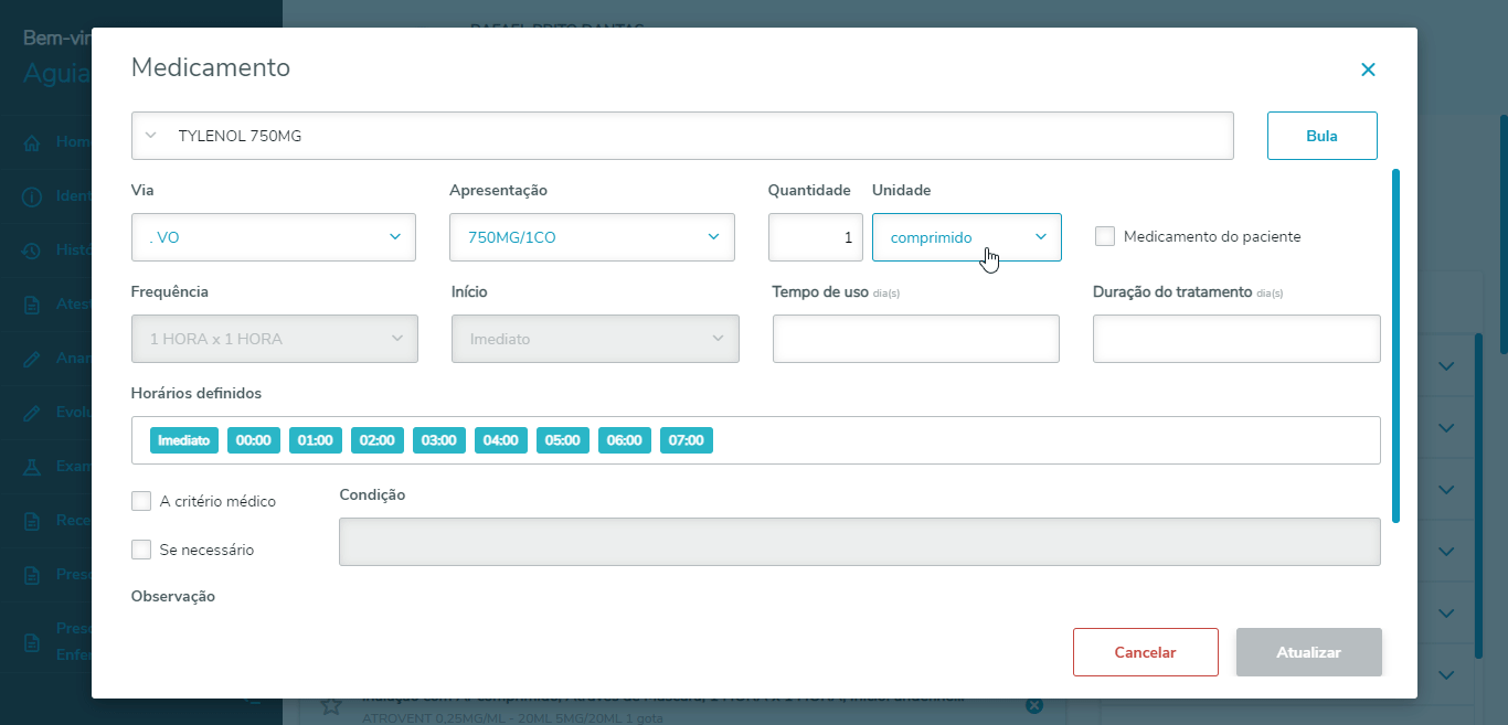 Na aleta de Medicamentos, quando o usuário clicar no item liberado desejado, deverá ser aberta a tela com os dados do item carregado, porém com os seguintes campos bloqueados: Medicamento, Frequência e início.
