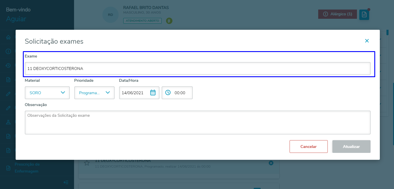 Na aleta de Solicitação de Exames, quando o usuário clicar no item liberado desejado, deverá ser aberta a tela com os dados do item carregado, porém com o seguinte campo bloqueado: Exame.