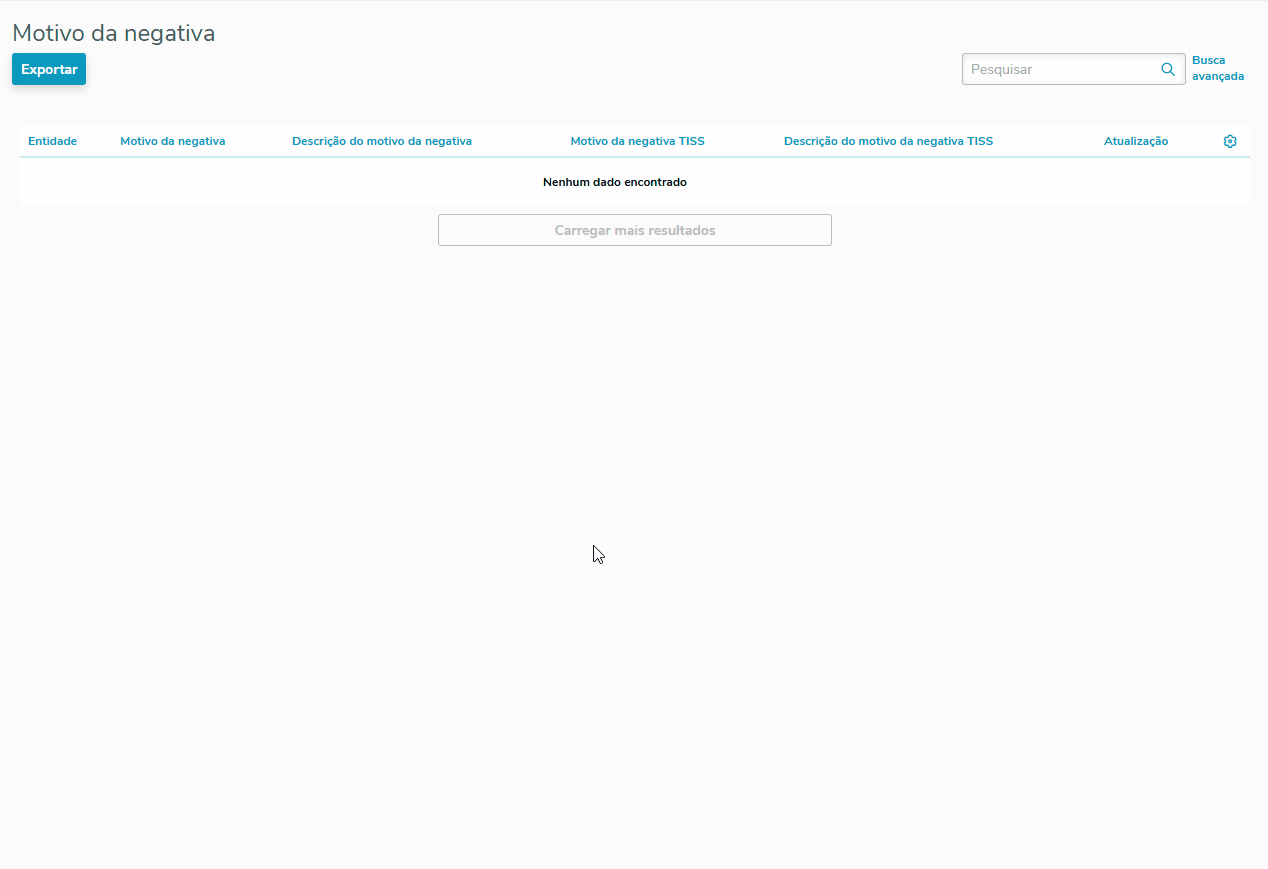 É possível encontrar registros informando parâmetros na caixa de pesquisa. Se informados números a pesquisa será realizada através do código do motivo da negativa e do código do motivo da negativa TISS, caso informado caracteres alfanuméricos, a pesquisa será realizada através da descrição do motivo da negativa e da descrição do motivo da negativa TISS.