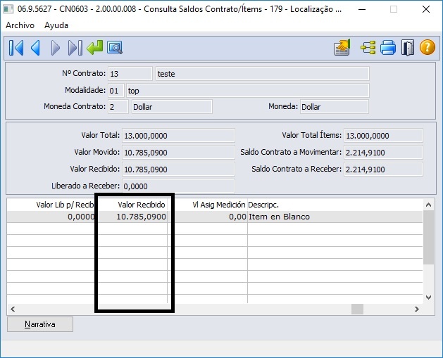 Ao atualizar a nota fiscal, será possível ver o Valor Recebido através do programa Consulta Saldos Contrato/Itens (CN0603).